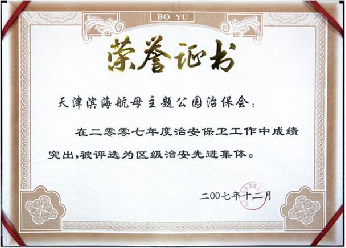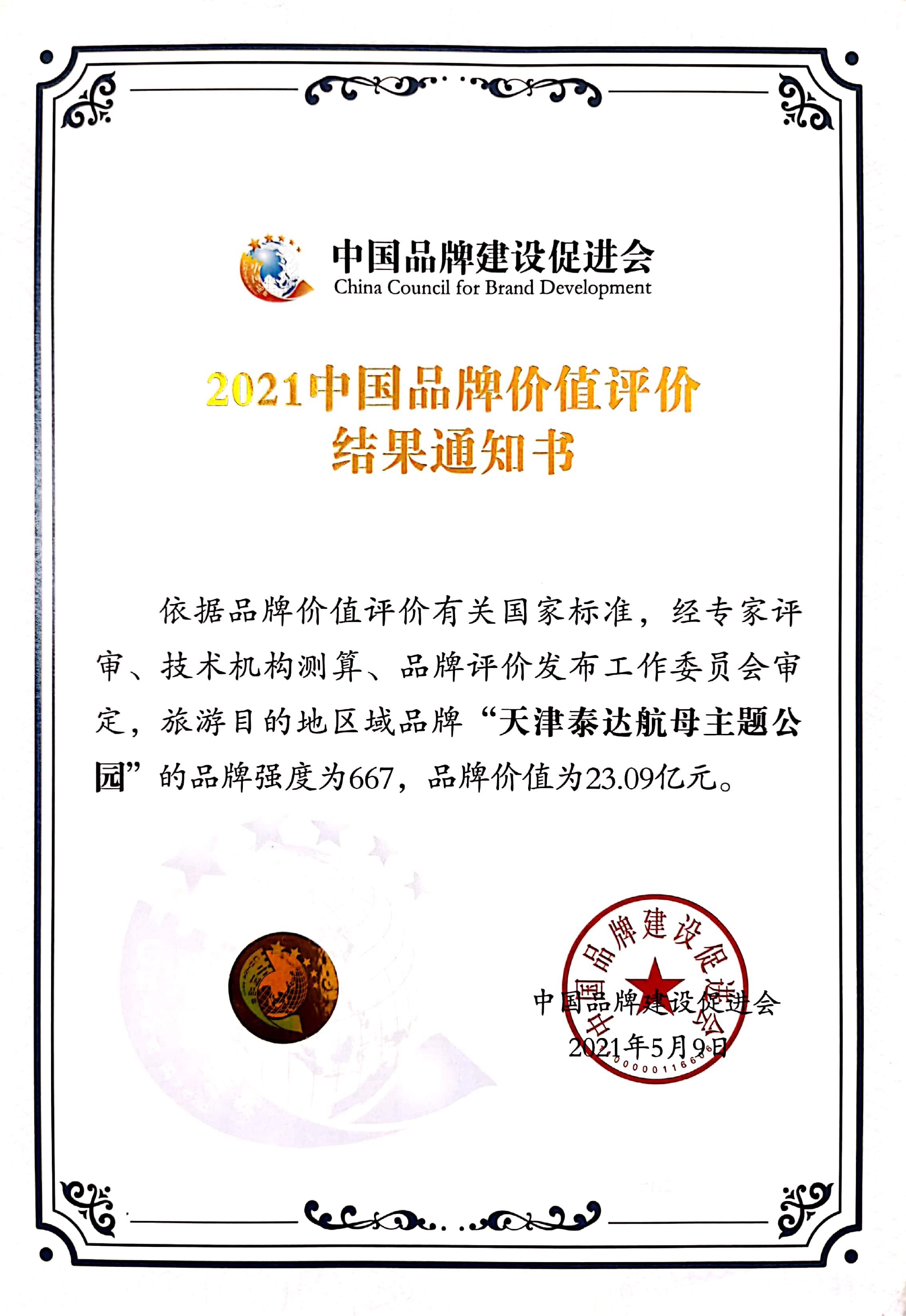 2019年5月9日,經中國品牌建設促進會依據品牌價值評價有關國家標準經專家評審、技術機構測算、品牌評價發布工作委員會審定,“天津泰達航母主題公園”區域品牌價值為20.18億元。